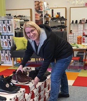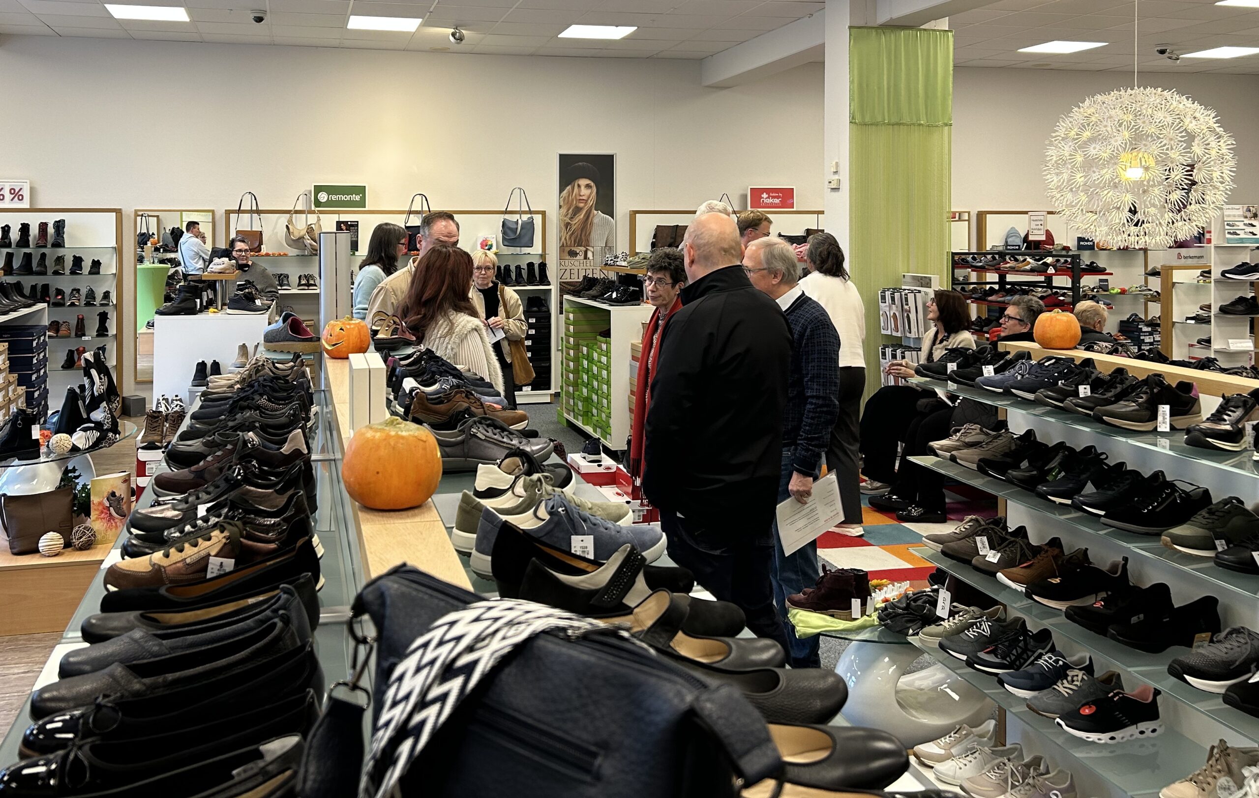 Im Rahmen einer ausführlichen Betriebsbesichtigung erhielten die Teilnehmer spannende Einblicke in das Konzept von Wolkenläufer. Der Fokus des Unternehmens liegt auf einem hochwertigen Mix aus Damen- und Herrenschuhen mit Komfortanspruch – bei hervorragendem Service: „Ich habe einen Leitspruch ,Der zufriedene Kunde ist unser Standard, der Begeisterte unser Ziel‘. Das leben wir! Wir wollen begeistern und ein Einkaufserlebnis schaffen. Das fängt bei uns schon mit den kostenlosen Parkplätzen direkt vor der Ladentür an“, so Julia Dorn. Die Wohlfühlatmosphäre spürten auch die ERFA-Teilnehmer:innen im hellen Ladengeschäft sogleich.