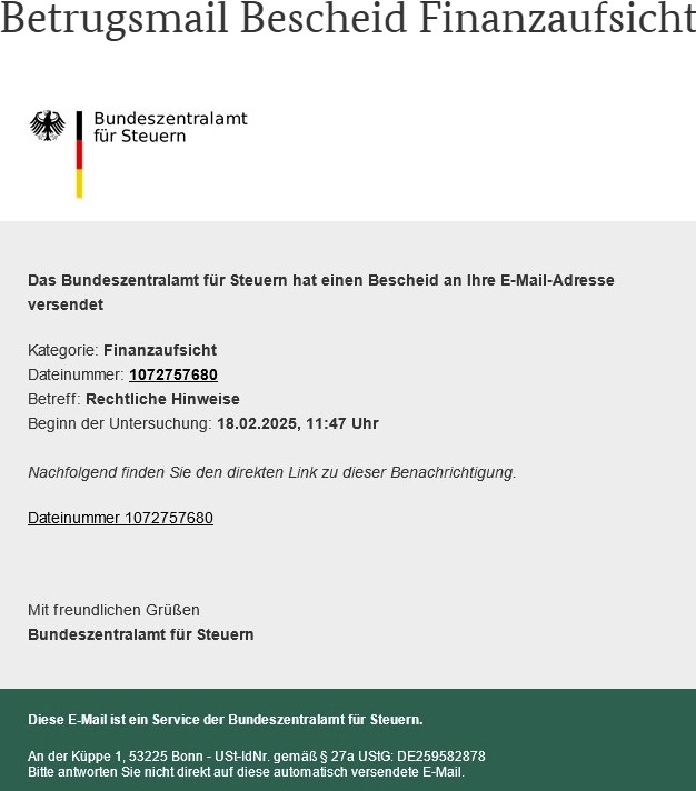 Aktuell sind verschiedene betrügerische E-Mails im Umlauf, die vorgeben, vom Bundeszentralamt für Steuern zu stammen.