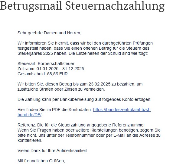 Die Empfängerinnen und Empfänger der betrügerischen E-Mail werden aufgefordert, eine angeblich offene Steuerschuld zu begleichen. Hierfür soll ein Link geöffnet werden, um die genauen Kontodaten zu erhalten. In der E-Mail wird die Empfängerin/der Empfänger nicht direkt mit Namen angeschrieben, sondern mit „Sehr geehrte Damen und Herren“.