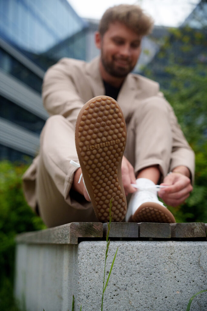 Fangen wir mit „Made in Germany“ an: kurze Transportwege und soziale Nachhaltigkeit in Form von sicheren Arbeitsplätzen sind bei leguano Standard, fragwürdige Herstellungsmethoden in Billigländern lehnt das Unternehmen ab. Ebenso wichtig: Bedacht gewählte Werkstoffe, die den Wiederverwertungs-Kreislauf später nicht überlasten und im Schnitt durch 42 Paar Hände gehen, bevor sie in Form eines leguano Barfußschuhs angeboten werden.