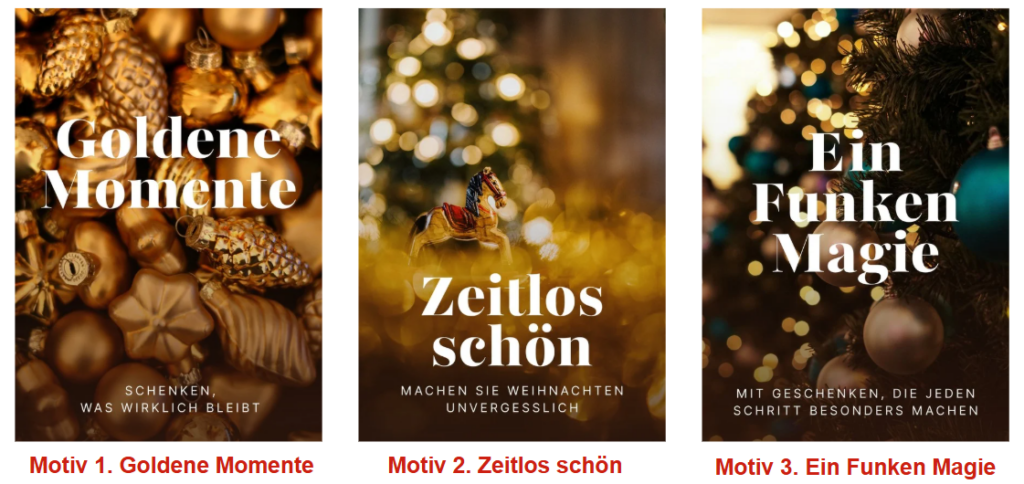 Marketing-Strategie: Mit „Goldene Momente“ setzt Du auf eine emotionale Weihnachtsbotschaft: „Schuhe schenken goldene Momente“. Ziel ist es, in der Weihnachtszeit Deinen Umsatz zu steigern und die Kundenbindung zu stärken – mit einem Fokus auf Gutscheine, Geschenkideen und Accessoires. Im Mittelpunkt stehen Familien, Paare und Deine Stammkundschaft.